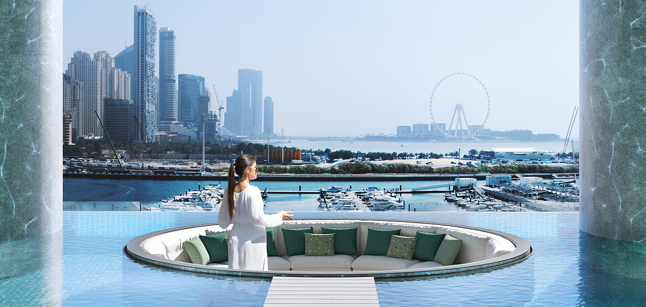 Panoramic views of Dubai Harbour, Bluewaters Island, The Palm Jumeirah and Dubai Marina from every apartment