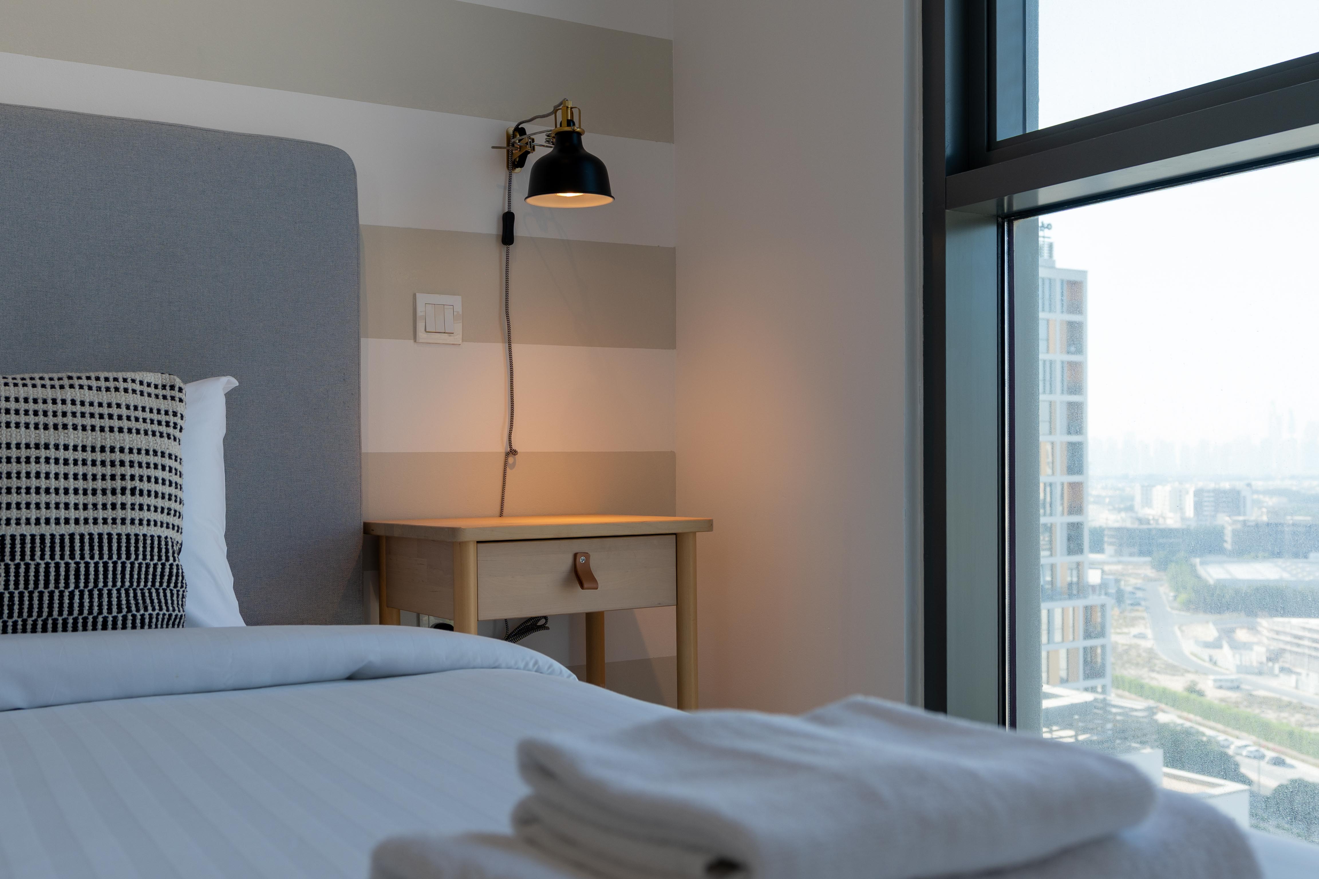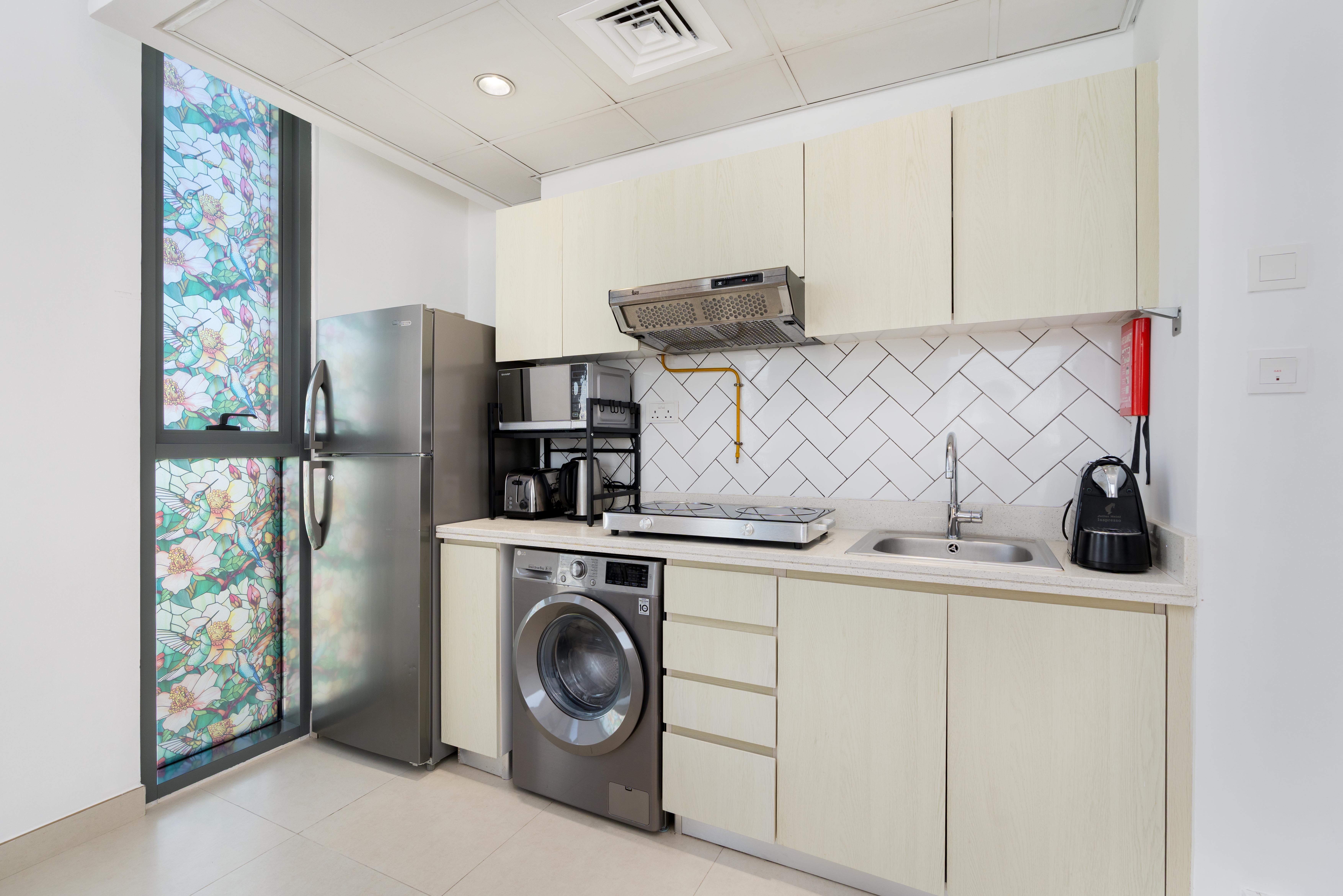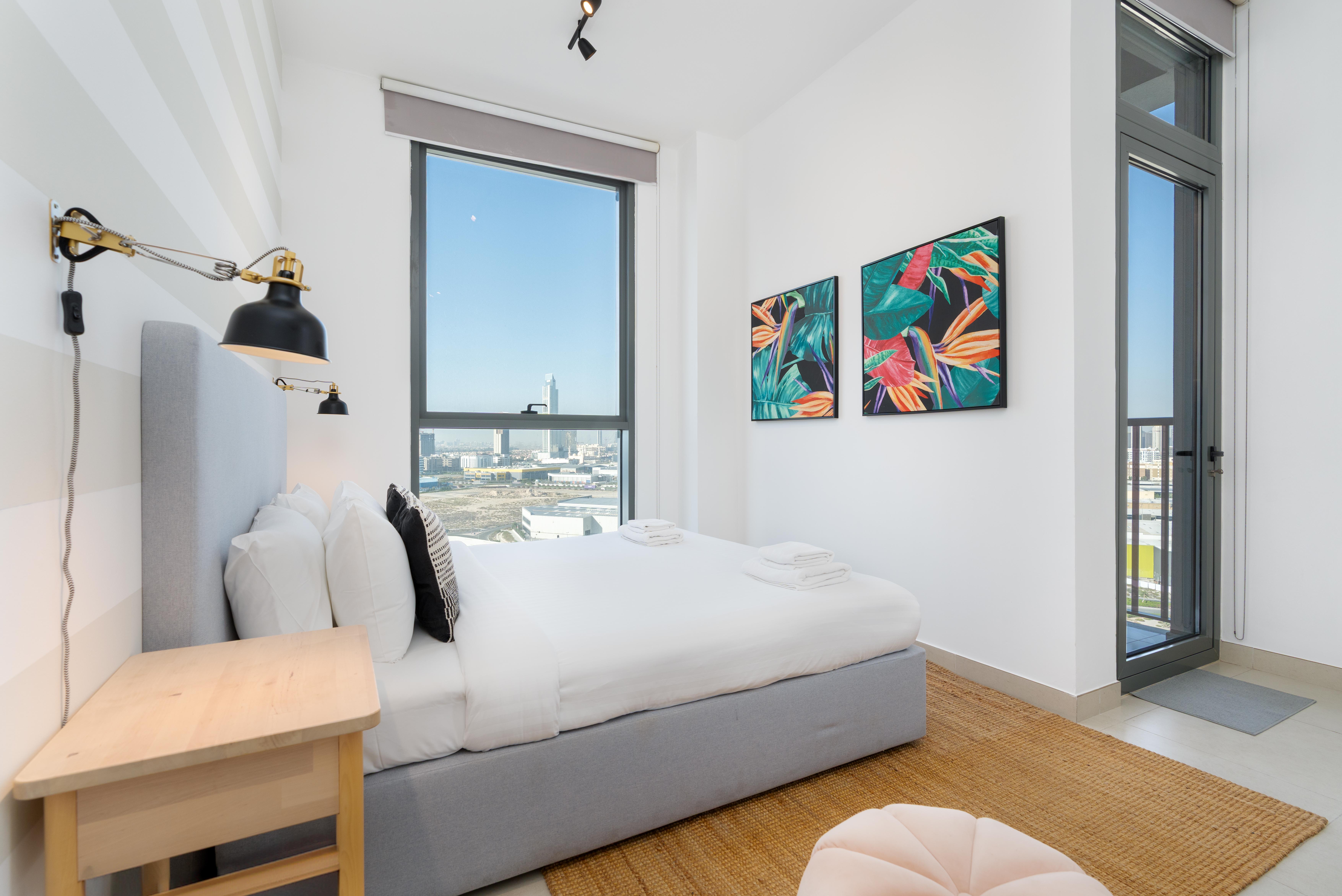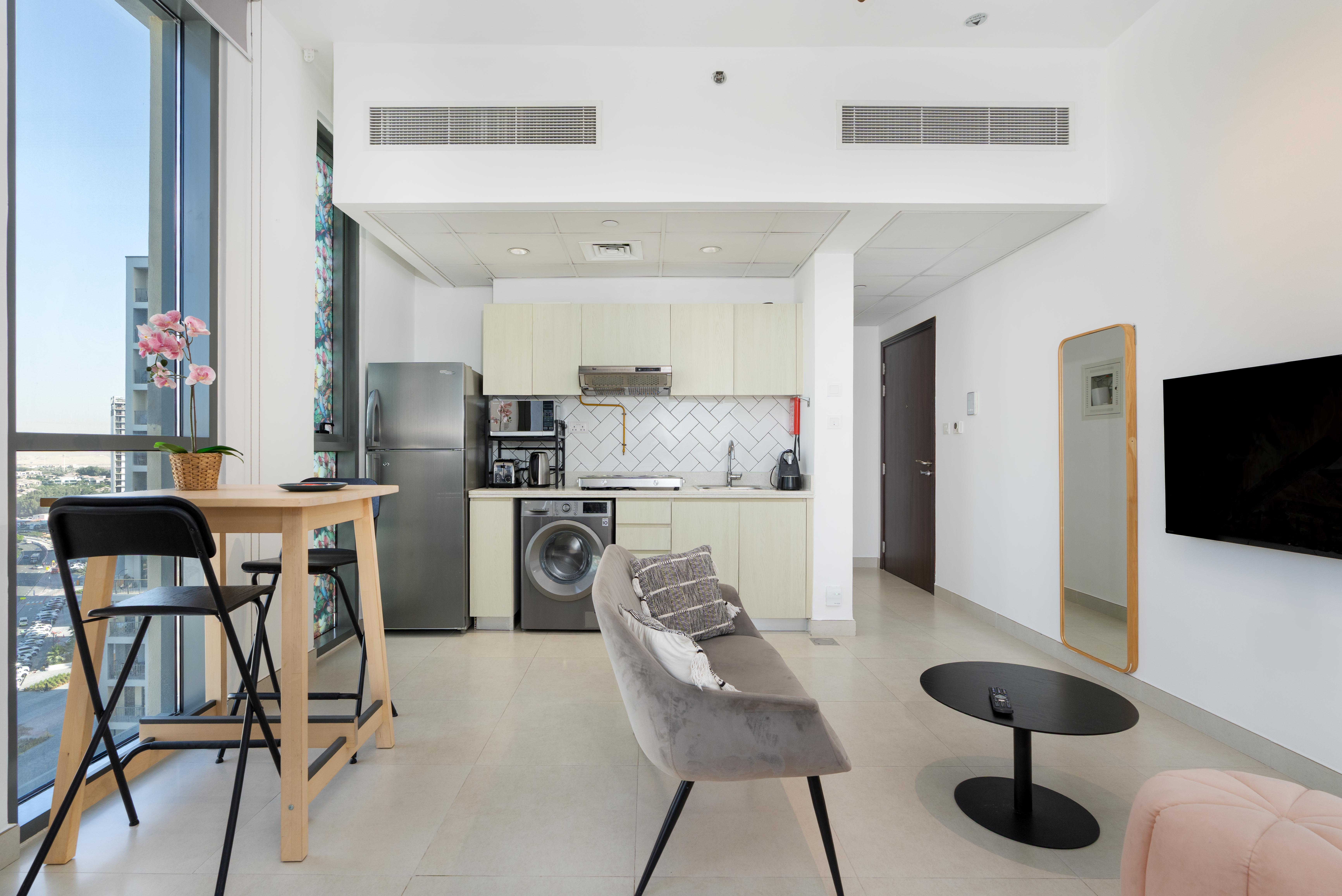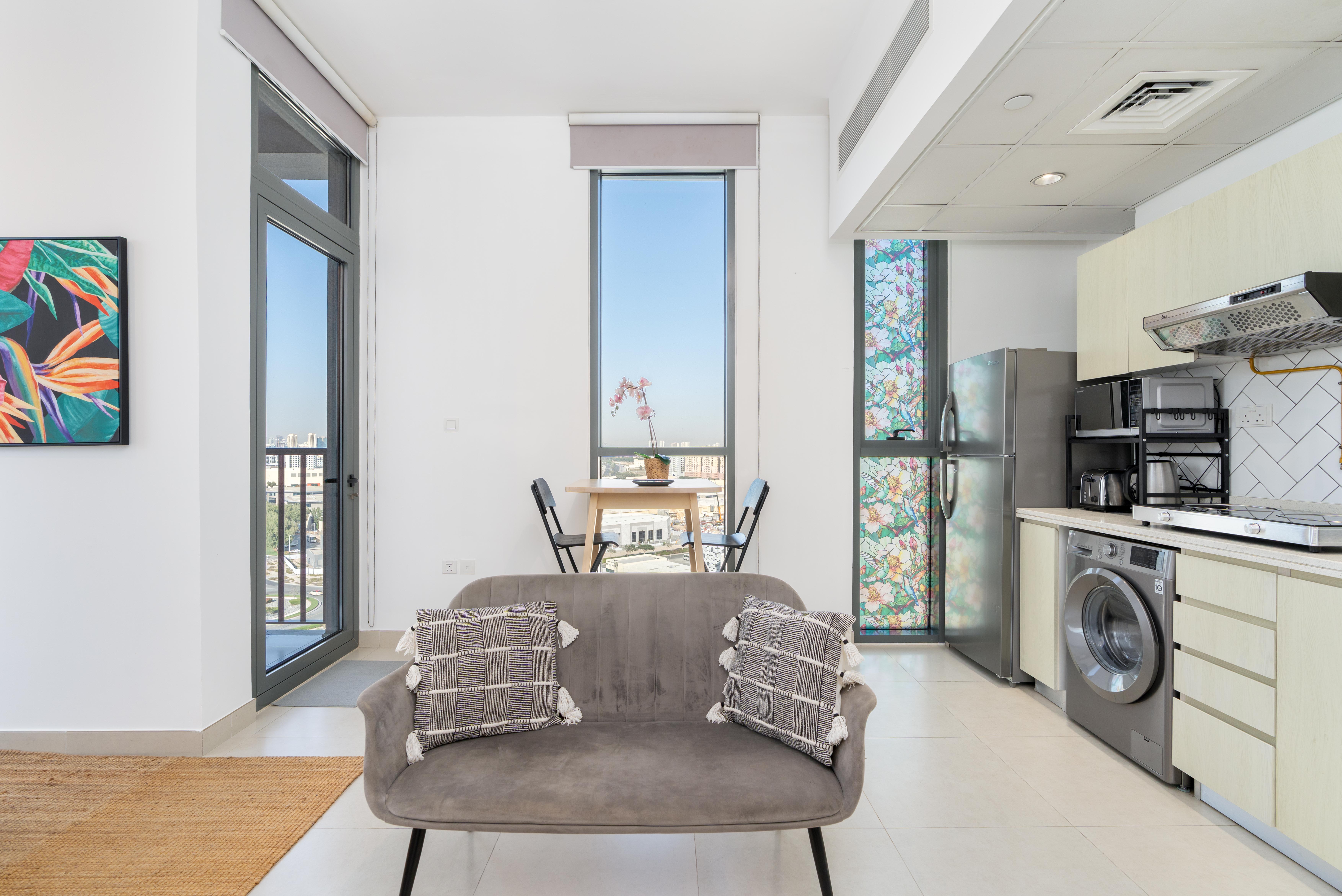 The studio apartments in Dania 2 offer a spacious 427 sq. ft. of thoughtfully designed living space. These units feature an open-style, fully fitted kitchen and a modern bathroom with high-quality fixtures. The living area opens up to a private balcony, offering a serene outdoor space with stunning views. The apartments boast elegant marble flooring and exquisite finishes throughout.