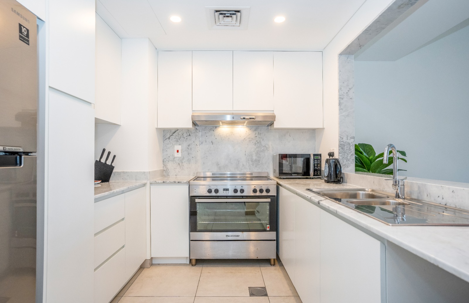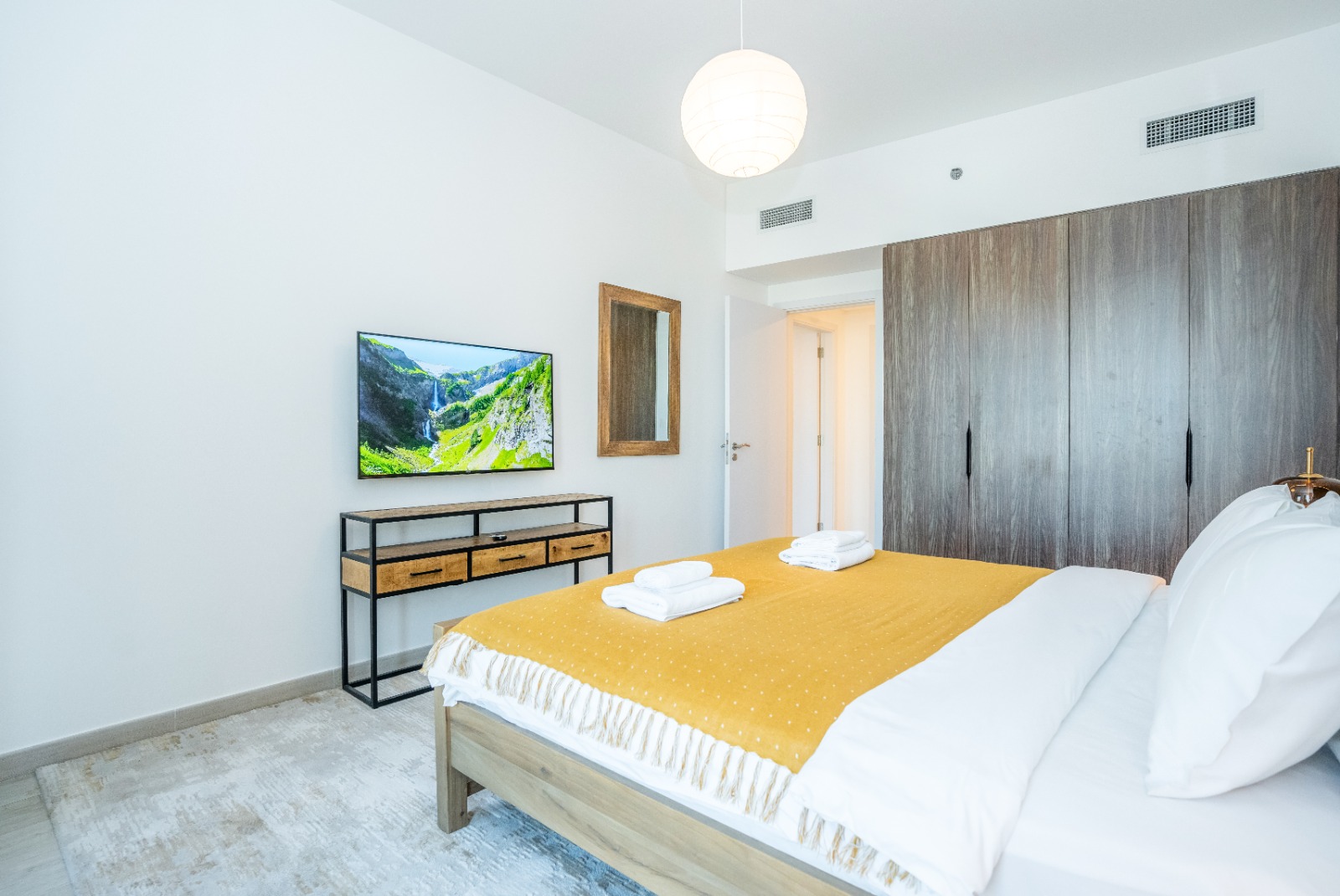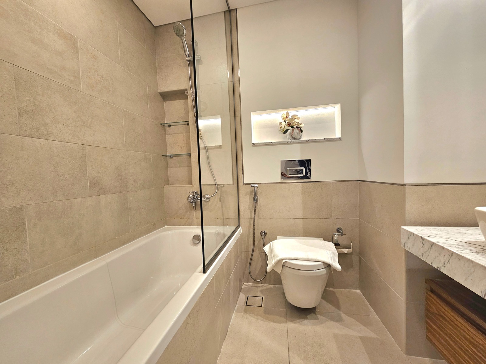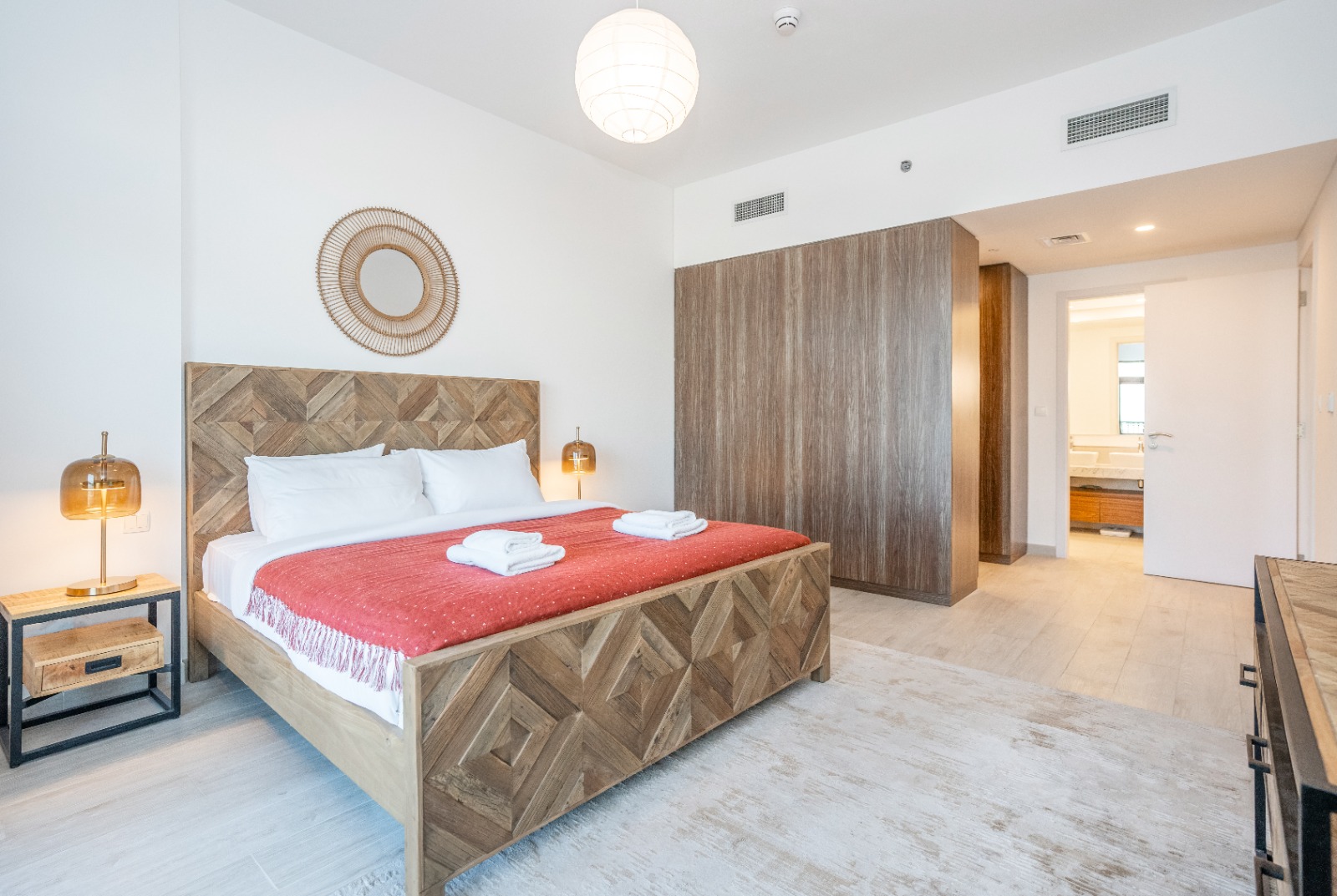 The apartment includes two spacious bedrooms. The master bedroom has an en-suite bathroom and a king-size bed, while the guest bedroom also features a comfortable king-size bed. There are two full bathrooms with modern fittings.