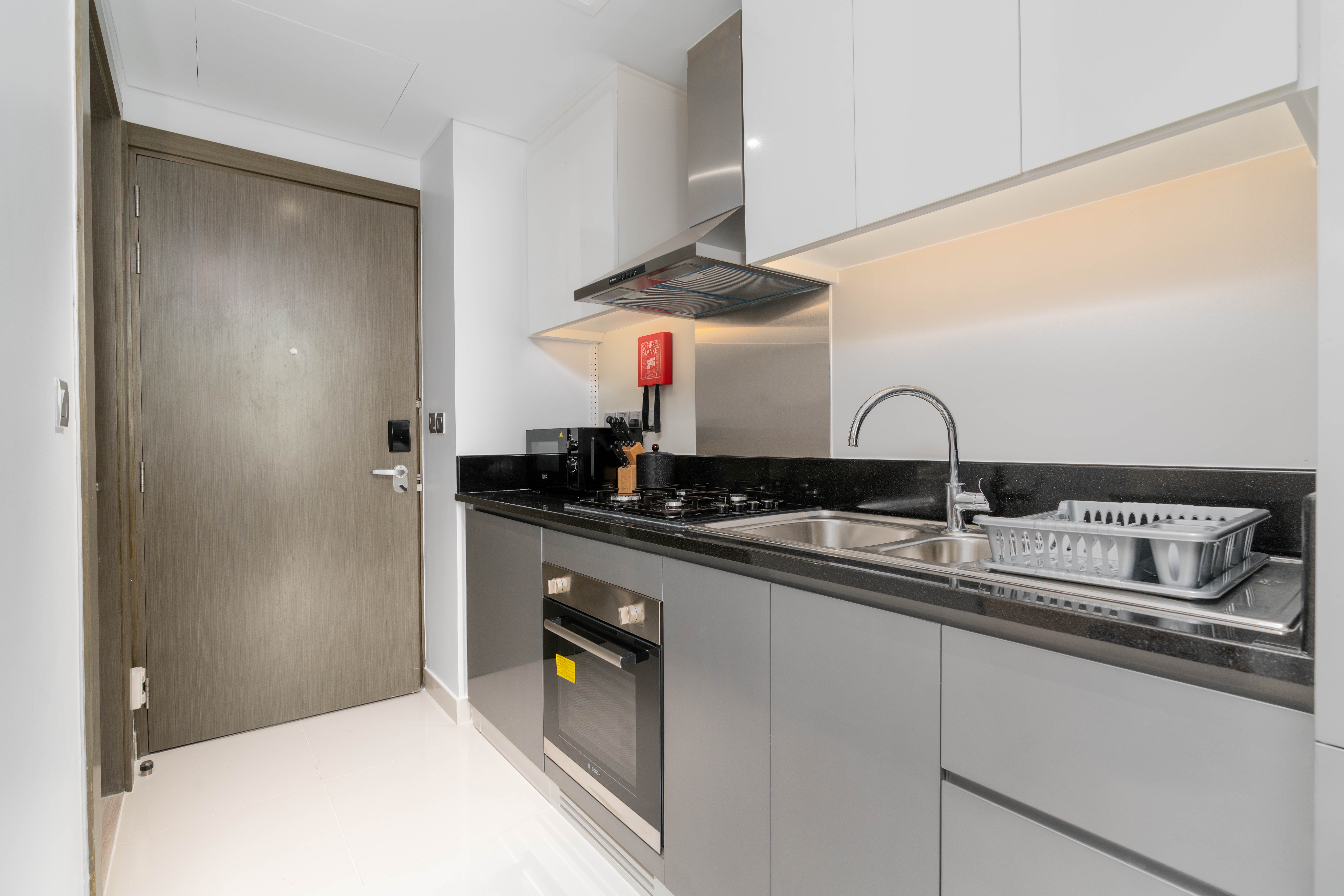 One King-size bed for 2 Adults and 2 kids (Sofa Bed) could accommodate easily. Smart TV, Free Wi-Fi, and basic cookware are all furnished to make your stay easy. A work table is provided so you can work from home.